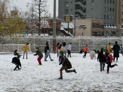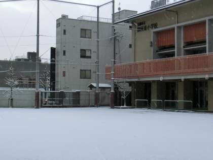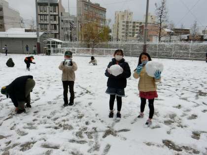 天気予報通り,京都市にも雪が降りました。雪で一面が真っ白な運動場。いつもより少し早めに登校して,雪に足跡をつけながら駆け回ったり,雪を丸めたりして遊ぶ姿が見られました。子どもたちは,久しぶりに積もった雪に大喜びでした。
