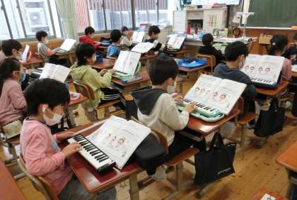みんなで合わせてたのしもう (1年) 公開日 2022/02/02 更新日 2022/02/02 1年生 「とんくるりん ぱんくるりん」の範唱を聴いて3拍子のまとまりを感じ取った後に,鍵盤ハーモニカと打楽器を使って演奏しました。互いの音をよく聴き合いながら演奏する姿が見られました。