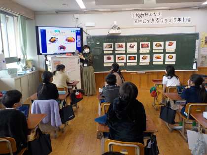 食の指導で,栄養教諭の野秋先生から,お節料理について教えてもらいました。おせち料理には”縁起をかつぐ”食材がたくさんつめられています。まずは1つ1つの食材に,どのような願いが込められているか,クイズ形式で考えていきました。