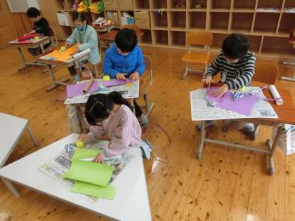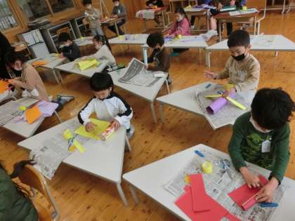 図画工作科「かみざら コロコロ」で,今日は,紙皿と紙皿をつなぐ部分を作りました。好きな色の画用紙を選んで,筒や箱を巻き,その後で飾り付けをしました。回転させながら転がる様子もイメージして,飾り付けを楽しんでいました。毎週,少しずつできあがっていくことが,楽しみな様子です。