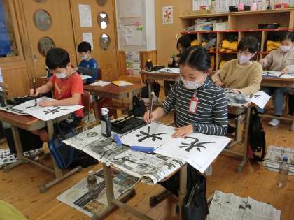 学習のまとめ (3年) 公開日 2022/02/17 更新日 2022/02/17 3年生 1年間の学習のまとめとして「光」という字を書きました。書く時のポイントは,筆の軸を回さないようにして曲げる。筆を一度止める。穂先をまとめながら上にとめるの3つです。気持ちを整えて,一筆一筆ていねいに書きました。