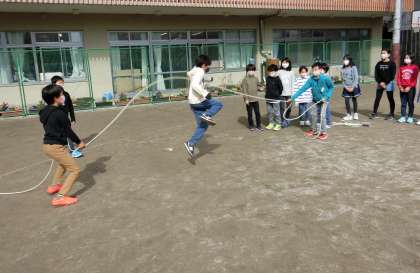 大なわとび 〜体力アップタイム〜 公開日 2022/02/21 更新日 2022/02/21 4年生 体力アップタイムでは,大なわに取り組んでいます。練習を重ねるごとにリズムよく跳ぶことができるようになってきました。みんなで数を数えたり,ひっかかっても「どんまい!」と声をかけたりする姿が見られます。仲間とともにがんばっています。