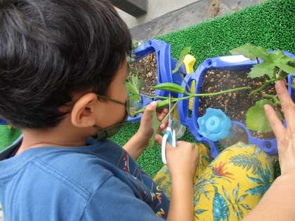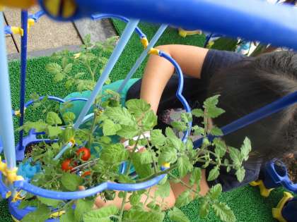 一人一鉢で育てている野菜がずいぶん大きく育ってきました。ミニトマトがきれいに赤く色づいたり,オクラもぐんと伸びたりしてきました。「早く食べたいけれど,もう少し大きく育ってほしいな」など,毎日お野菜とお話しながら大切に育てています。