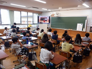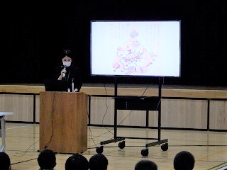 今回は,3組・1年・2年・3年生が体育館で参加し,それ以外の学年は教室からオンラインで参加しました。
