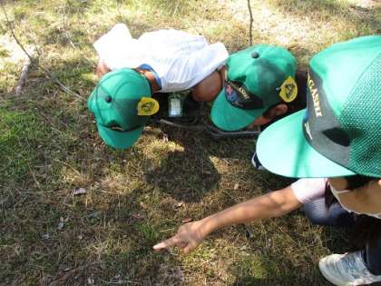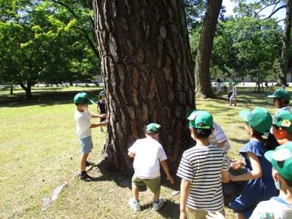 生活科の学習で,夏を見つけに御所へ行きました。御所へ着くと,すぐにセミの元気な鳴き声が聞こえてきました。とても良いお天気で,暑い日でしたが,子どもたちは,野原を駆け回ったり,いろいろな虫を見つけたりして,楽しく学習をすることができました。「夏は,緑や黄緑の葉っぱがたくさんあるよ。」「夏は暑いけど,日かげは涼しいよ。」と,たくさんの夏を見つけることができました。