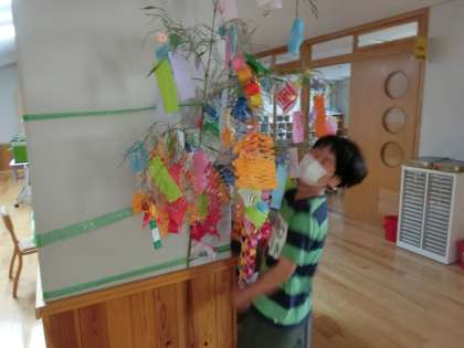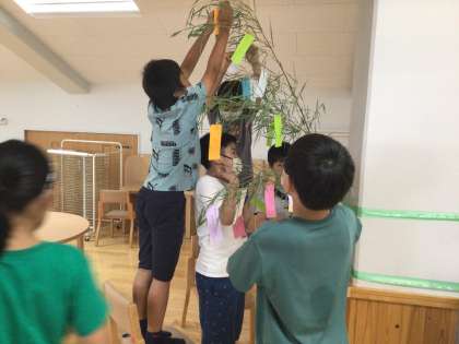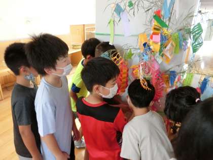 7月7日はポニーテールの日でもありますが,日本の五節句の1つの七夕です。『7月7日七夕の夜は天の川を隔てて彦星と織姫が 一年に1度だけ逢うことを許された夜...』というお話が中国から伝わり,今もなお日本で伝説として語りつがれています。七夕の笹飾りは江戸時代になって,無病息災や商売繁盛,技芸の上達などを願う飾りを笹竹につける風習が庶民に広まったそうです。そんな伝説やお話にあやかり,5年生でも星に願いを込めて,笹飾りを作りました。みんな思い思いの願いを短冊に記入し,笹竹に短冊をつけていました。みんなの願いが叶うといいですね。