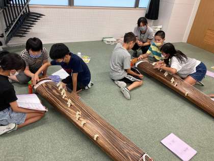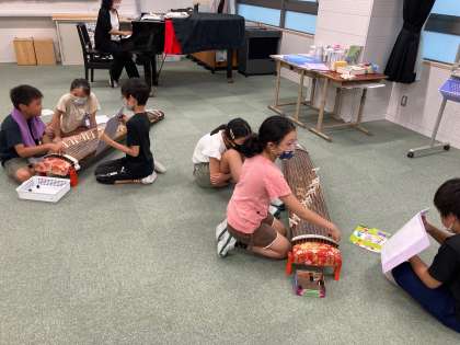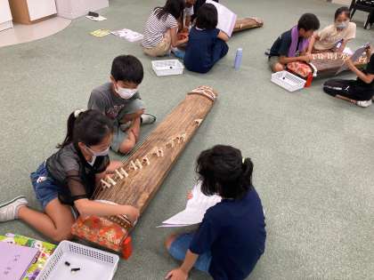 日本の楽器に親しもう (5年) 公開日 2022/07/20 更新日 2022/07/20 5年生 音楽科『日本の楽器に親しもう』の学習で,琴の演奏を体験しました。弦の場所を確認し,爪の使い方を学び,実際に『さくら さくら』を演奏してみました。楽譜を見せたり,弦の場所を歌いながら教えたりしながら,協力して琴に親しむことができました。
