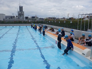 まず,子どもたちは服を着たままプールに入り,いつもと同じように泳いでみました。普段,泳ぎが得意な子でも「服が重くて,上手に進まない。」と思うように泳げないことがわかりました。そして,着衣のまま水に落ちてしまった場合は,「あわてない(無駄な体力を使わない)」ことがわかりました。