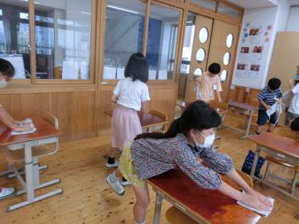 今日は,1学期の最終日。毎日,元気いっぱい過ごして来た教室をピカピカに掃除しました。机やイス,ロッカーやまどなどを隅々まで丁寧に拭いていました。また,教室以外でも身近でよく使うところをがんばってきれいにしてくれ,2学期から気持ちよく過ごせそうです。