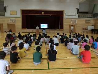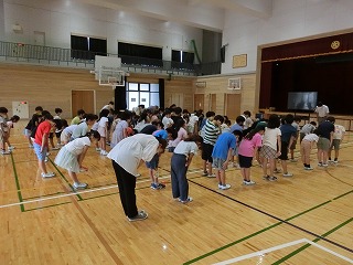 校長先生から夏休み中に京都で行われた「祇園祭」や「五山送り火」を例に、それぞれ華やかに見える面と裏で支える人々の姿や思いがあること、またその人々は本番に向けて協力しながら努力していることなどについて話がありました。