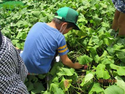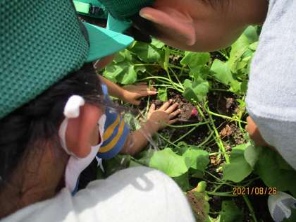 夏休みの間も,学校園の夏野菜にたくさんの実がなりました。夏野菜は,「お味噌汁」や「お漬物」「カレー」「サラダ」などいろいろなお料理で食べたことを報告してくれました。自分で育てた野菜なので,一層,美味しく感じてたようです。苦手な野菜も,「食べてみたら,美味しかったよ」とうれしそうに話していました。秋は,「サツマイモ」です。たくさんつるが伸びてきた「サツマイモ」にも,土の中で実ができていることろが見えました。「土の中で,どれくらい大きくなっているんだろう」と成長に興味をもったり,本で調べて「葉が枯れてきたら収穫できるみたいだよ」と話したりしながら,収穫を楽しみにしている様子です。