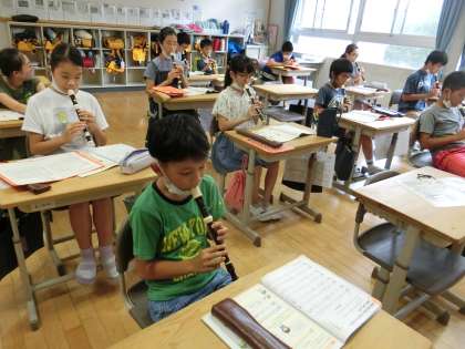 リコーダーで表現しよう (6年) 公開日 2022/08/26 更新日 2022/08/26 6年生 今日の学習のめあては,「旋律の特徴を生かして表現しよう」です。ブレスの記号を参考にしながら,旋律のまとまりに気を付けて「メヌエット」を演奏しました。みんな真剣な表情で,低い音も高い音も同じようにきれいに響かせられるように集中して吹いていました。