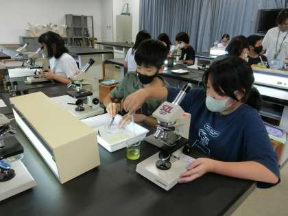 顕微鏡を使って調べよう (6年) 公開日 2022/08/26 更新日 2022/08/26 6年生 「川に住む小魚は,どんなものを食べているのだろう」という学習問題を解決するために,顕微鏡を使って調べました。5年生で顕微鏡の使い方を勉強しているので,手慣れたものです。川の水には,目には見えない小さな微生物がいますが,不思議な形や動きに驚いていました。