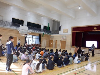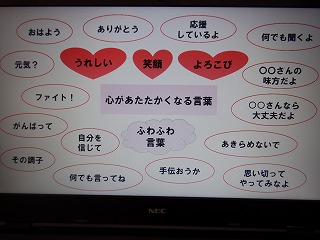 朝会では、校長先生から人権について、「ふわふわ言葉」や「チクチク言葉」を例に、話がありました。子どもたちは、「ふわふわ言葉は、言っている自分も気持ちよくなる。」や「チクチク言葉は、自分に言われていなくても嫌な気持ちになる。」と気付きました。全校で「言葉」のもつ力について考えたことで、これからもっと「言葉」を大切にしていく必要があることを確認することができました。