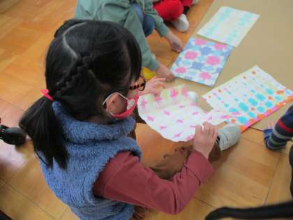久しぶりにみんなで集まっての作品作りで、6年生から歌のサプライズもあり、とても和気あいあいとした雰囲気で楽しい作品を製作することができました。低学年の友達にお花の作り方を教えてあげたり、他学校の友達と一緒に折り紙をちぎったりしながら、たくさん交流することができました。