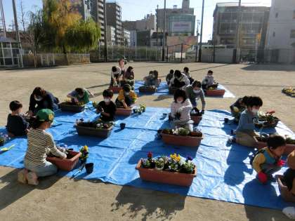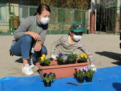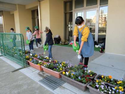 お花を植えたら、「大切なお花たちだから倒さないように」と、力を合わせてプランターを運びました。