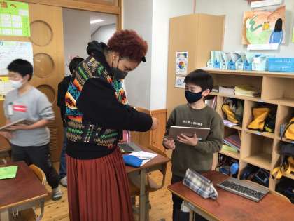 一人ひとりが自分で考えた店を用意し、練習中だった値段の言い方も思い出しながらやり取りを楽しんでいました。「ALTの先生が来るから、好きなアニメの商品も準備しよう!」と言っている子どもたちもいました。2学期からお世話になっている先生とも、たくさんコミュニケーションが取れるようになり、いつも待ち遠しくしているようです。