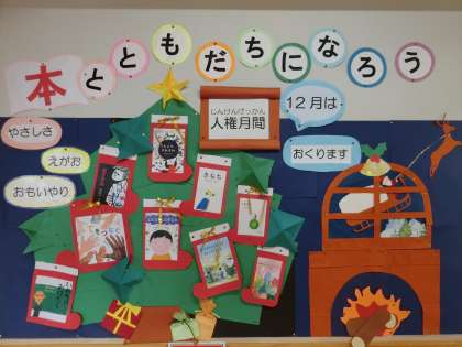 12月の読書センター 公開日 2022/12/22 更新日 2022/12/22 学校の様子 朝から雨が降っていました。読書センターには今日もたくさんの子どもたちがやって来て読書を楽しんでいました。12月は、人権月間です。「笑顔」「やさしさ」「思いやり」に関わった本がたくさん紹介されています。ぜひ、手に取って読んでみてください。