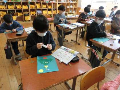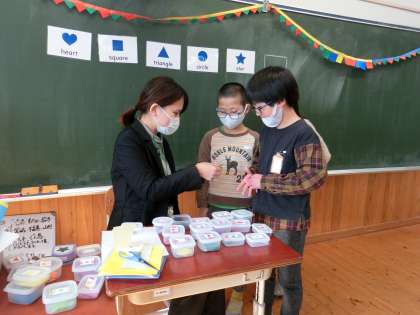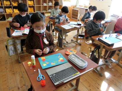 教室を覗くと外国語活動の時間にカードを作っていました。素敵なデザインのカードを作るために、大小様々な形のカードを選んで組み合わせていきます。先生から「What’s do you want?」と尋ねられると、「Two yellow heart please.」「One orange circle please.」などと言ってたくさんの形カードをもらい、楽しみながら集中して取り組んでいました。