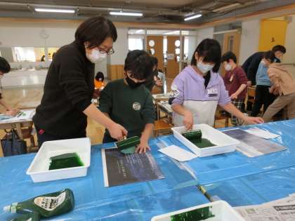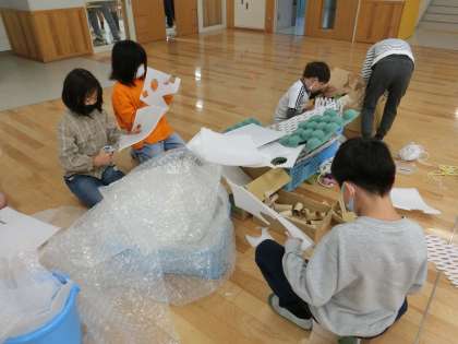 いろいろうつして1(3年) 公開日 2023/01/12 更新日 2023/01/12 3年生 片面波段ボール緩衝材、毛糸やロープなどの身辺材料を使って、写し出すことを楽しんでいました。材料を見たり触ったりしながら模様や質感、形を確かめて、色をつけていきます。