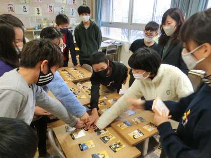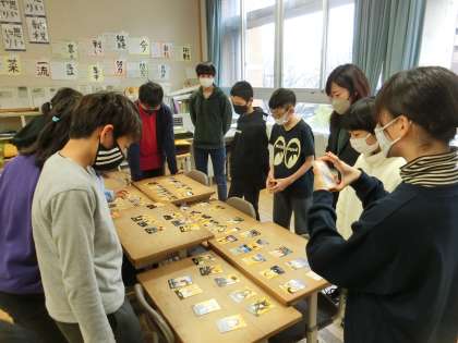楽しくみんなで学ぶ(6年) 公開日 2023/01/16 更新日 2023/01/16 6年生 年末のマジックサンタからのプレゼントは、カルタや百人一首でした。6年生には、社会科の学習に出てきた歴史上の人物について書かれた読み札を基に作られた歴史カルタでした。人物の業績をよく聞いて、たくさんあるカードから素早く見つけて勢いよく取っていました。