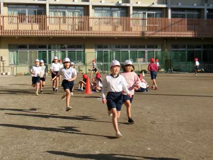 無理のない一定の速さで、5分間程度を続けて走ることにチャレンジしています。肘を軽く曲げて前後に振っていたり、足をかかとから着けていたりするなど、友達の走り方を見て自分の走り方に生かす姿がたくさん見られました。