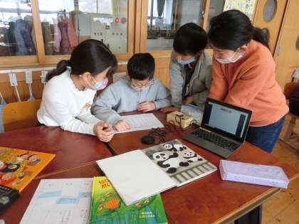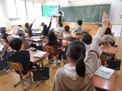 国語科の学習で、たくさん出てきた意見を一つにまとめる「協議」について学習しています。この日は、自分たちの話し合いの様子を映像に撮り、よいところと困っているところを出し合って、よりよい協議にするためにはどうすればよいかを話し合いました。