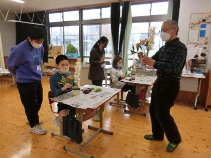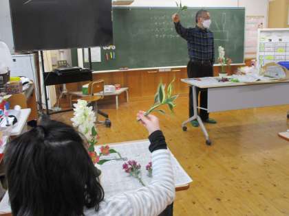 今年度最後の生け花体験がありました。松本先生に来ていただいて、子どもたちはとてもうれしそうにしていました。今回の生け花では、シンピジウム、キンギョソウ、スプレーキク、サンデリアーナ、アルストロメリアの5種類のお花を生けました。