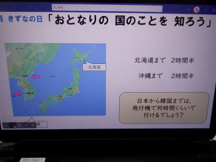また、きずなの日の取組として、「おとなりの国のことを知ろう」というテーマで、担当の先生からお話がありました。「韓国・朝鮮には、似ているものが多いな。キムチなどの食べ物はよくお家でも食べるよ。」と、子どもたちのつぶやきが聞こえてきました。その後は、各教室で「韓国・朝鮮」について学習していく予定です。