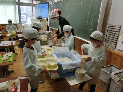 給食の配膳の様子(1年) 公開日 2023/02/06 更新日 2023/02/06 1年生 給食の配膳の様子です。もうすっかり板についています。一生懸命に任された役目を果たしています。時間内に配膳ができて、みんなでおいしくいただいています。