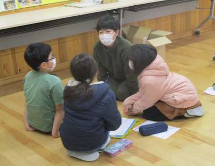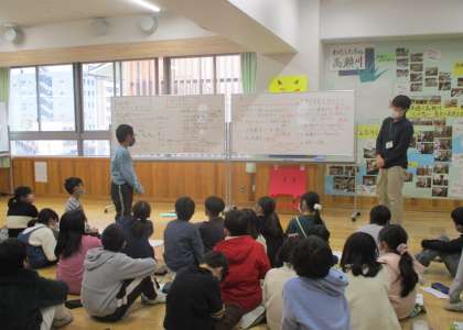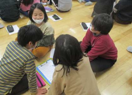 御所東小学校の町に住んでいるお年寄りの方のためにできることはないか話し合いました。「元気」に「健康」で「笑顔」でいてもらうために自分たちにできることを考え、これからの計画を話し合うことができました。
