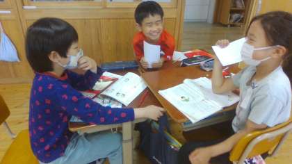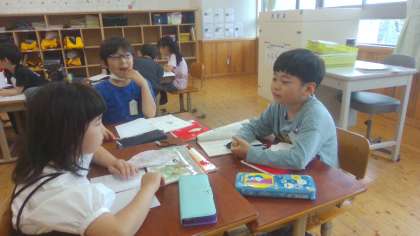 国語科『もっと知りたい、友だちのこと』で、友だちの話を聞いて「もっと知りたい」ことを考えて質問する学習をしました。話し手はそれぞれ自分の「大好きなもの」や「ぜひ伝えたいこと」などをテーマに話し、聞き手は話の中心に気を付けて質問を考えることができました。学習の終わりには「いっぱい質問してもらえて、うれしかった」「話を聞いて?(はてな)だったことが、質問をして!(ビックリ)に変わってよかった」「みんなの好きなものやことを質問して、詳しく知れてうれしかった」という、ふり返りも聞かれました。