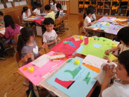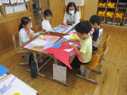 図画工作科「やぶいたかたちからうまれたよ」(1年) 公開日 2023/05/26 更新日 2023/05/26 1年生 図画工作科の学習では、 破いた形から想像を広げて、 考えたことを絵に表しました。 偶然できた形を、向きを変えたり重ねたりしながら見ていると、 面白い発見がたくさんありました。