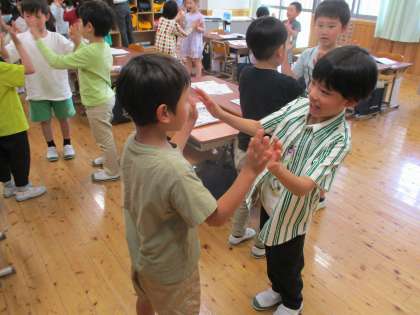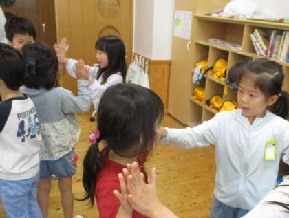 のリズムに合わせて、友達と一緒に手をたたきました。
