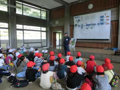 浄水場見学1(4年) 公開日 2023/06/07 更新日 2023/06/07 4年生 社会科「くらしと水」の学習で、琵琶湖の水がどのようにきれいになって自分たちのもとに届いているのかを調べるために、蹴上浄水場の見学に行きました。 ホールで話を聞いた後は、実際見学に出発です。