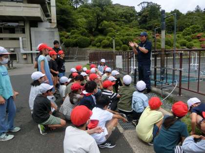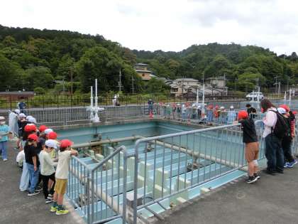 急速濾過池では、模型で説明してもらってから、実際に濾過する様子を見せていただきました。汚れた砂を洗うために、学校のプールより多い水が流れるのを見て、子どもたちは大きな歓声をあげていました。
