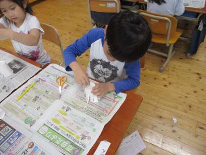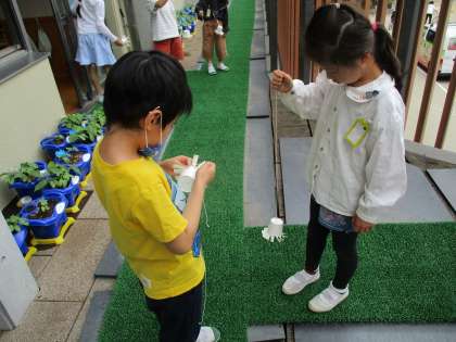 紙コップで風車のような形を作り、たこ糸で吊りました。