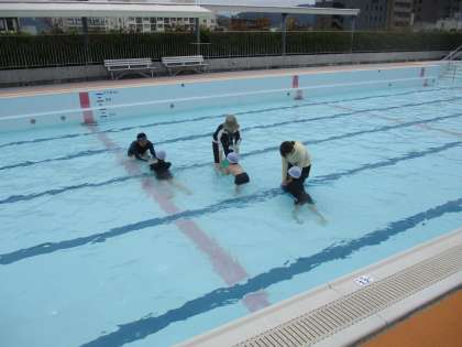 水なれでは、プールの中を歩くことから始まり、「カニ」「アヒル」「ワニ」「ラッコ」「ボート(ビート版けのび)」「モーターボート(ビート版けのびバタ足)」「ロケット」「潜水艦」など生き物やものに例えながら泳ぐことへとつながる活動に取り組みました。