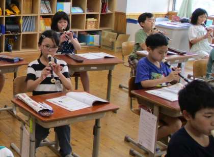 音楽科の時間に、リコーダーの学習を頑張っています。たくさんの子どもたちが、リコーダーの学習が始まるのを楽しみにしていました。しかし、思っていたよりも指使いが難しいようで、思った音がなかなか出せず、苦戦している子もいますが、練習を重ねるたびに、少しずつ指使いや息の使い方に慣れてきたようです。「シ」と「ラ」の2音で、「夕焼け小焼け」の歌にもチャレンジしています。