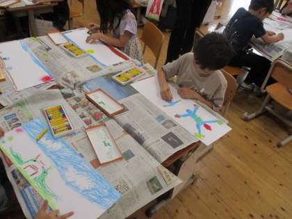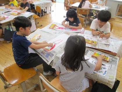 図画工作科「こんなかみなら なにをかこう」(1年) 公開日 2023/06/15 更新日 2023/06/15 1年生 図画工作科の学習では、細長く切った画用紙に絵を描きました。 いつもと違う形の紙だと、想像するものも違ってきます。 横長において広い原っぱにしたり、 縦においてタワーにしたりと、 それぞれが発想を広げて表現できました。