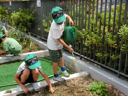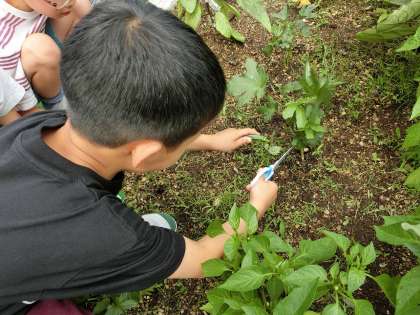 屋上の花壇の野菜がぐんぐん育っています。屋上は、日当たりがよく、一人一鉢の野菜よりも大きく育っていて、びっくりしています。お水をたっぷりとあげたり、草ぬきをしたりして大切に育ててきました。オクラが収穫の時期です。お家にも順番に持ち帰っていますので、ぜひ、いろいろなお料理で味わってみてください。