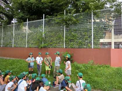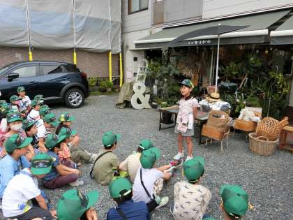 町探検で、鴨川方面や河原町通りを北に向かって探検しました。鴨川の近くには、素敵なお花屋さんやカフェがありました。お店の前を通ると、お花のいいにおいがして、紫陽花がとてもきれいでした。京都わかば園では、小さい子ども達が遊んでいる様子を「かわいいな」と見守っている2年生の姿が微笑ましかったです。卒園生は、久しぶりに先生に会えて、とてもうれしそうでした。八百屋さんの前を通ると、立派な野菜がたくさん並んでいました。今、野菜育てをがんばっている子ども達は、野菜に興味深々で名前や産地などどんどんお話が弾んでいきました。そんな子ども達に、ご厚意でサツマイモとナスをいただきました。みんなで味わい、感想をお伝えしたいと思っています。地域の方々の温かさに包まれながら、育まれていることを実感する町探険でした。