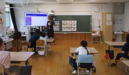 授業後半ではアマダラ先生の出身地であるアメリカ・シアトルの話をしていただきました。きれいな写真と共にたくさんの英語を聞く中で、子どもたちは「何となく聞いてわかる部分もあるなあ」ということに気づいてきたように思います。日本との違いや,逆に似ていることに、子どもたちは興味をもって聞いていました。