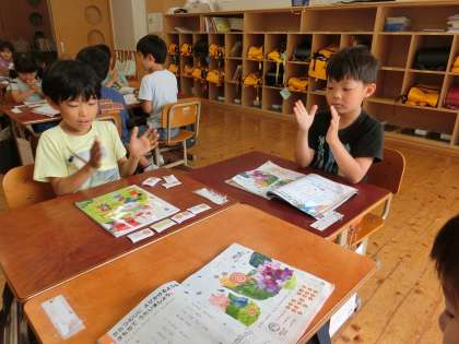 「タン、ウン、タタタン・・・」曲に合わせて、リズム打ちです。楽譜と一緒に示されたリズムの印を見ながら、間違えないように、遅れないようにと集中して取り組みました。