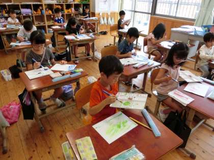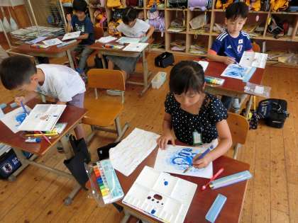 絵の具で描いたよ(2年) 公開日 2023/07/11 更新日 2023/07/11 2年生 図画工作の時間に、楽しみにしていた初めての絵の具の学習をしました。パレットや筆洗、筆、どの道具をどんな風に使うのか、みんな真剣に話を聞いていました。初めに、好きな絵の具の色を一つ選び、少しずつ水を加えていきました。少ないと「ねっとり」、たくさん加えると「シャバシャバ」、水の量を変えるだけで、絵の具が変わっていくことに驚きながら、楽しんで描いていました。