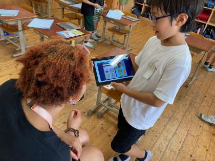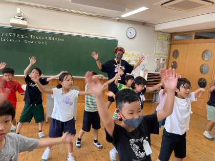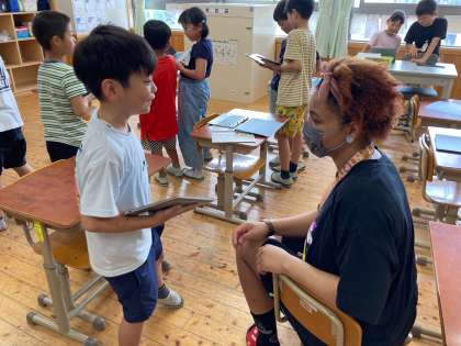 「I like blue.」の単元で学習した自分の好きなもの・苦手なものを紹介する活動をアマダラ先生と行いました。緊張した様子もありましたが、「I like〜」や「I don’t like〜」の表現だけでなく、「Do you like〜?」など好きなものを尋ねる表現も使ってコミュニケーションをとることができていました。最後の授業ということで、授業の終わりには、サプライズでこれまでに学習してきた歌やダンスのプレゼントをしました。アマダラ先生とより仲良くなって、お別れすることができました。