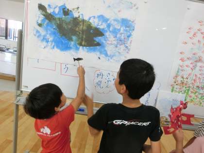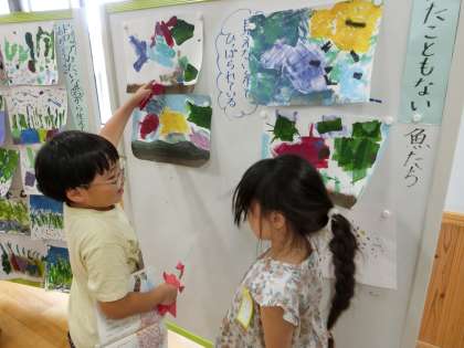 みんなでお話を紹介した後は、仲良しペアの友達に好きな場面を伝えました。ミサイルみたいに突っ込んできたまぐろから、スイミーだけが逃げた場面や海のすばらしいものとスイミーが出会って元気を取り戻していくところ、最後に大きなまぐろを追い出したところなど魅力的な場面がたくさんあり、話が盛り上がっていました。1年生にペープサートを持たせてあげて、一緒にお話を楽しむ姿も素敵でした。