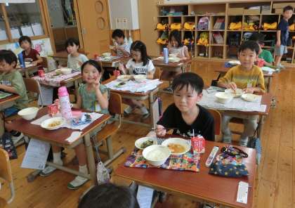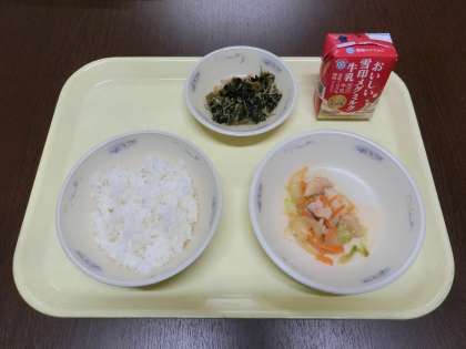 今日から給食が始まりました。メニューは、ごはん、牛乳、ほうれん草ともやしのごま煮、けいちゃんです。けいちゃんとは、岐阜県の郷土料理で、鶏肉と野菜を特性のたれを絡めて作った新献立です。香ばしいみその香りが、ごはんとよく合い、みんなでおいしくいただきました。