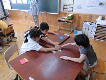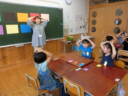 英語活動(1年) 公開日 2023/09/21 更新日 2023/09/21 1年生 英語活動「色=color」の学習で、先生が言った色カードを取るゲームをしました。手を頭の上に置いて、「Are you ready?」「Yes」「red」・・・など、仲間と一緒に楽しく英語に慣れ親しむことができていました。