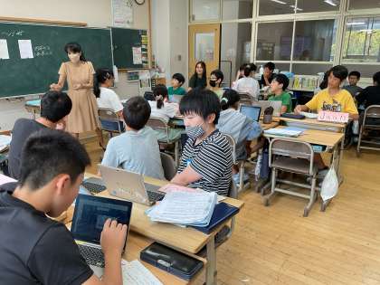 Unit4 My Summer Vacationでは、夏休みの思い出について伝え合う学習をしています。今日は、9月から来られた新しいALTの先生への自己紹介も兼ねて、夏休みの思い出紹介をしました。ただ伝えるだけでなく、自分が紹介したことについて、「Do you like 〜?」のようにALTの先生に質問をしながら、スピーチをすることができました。